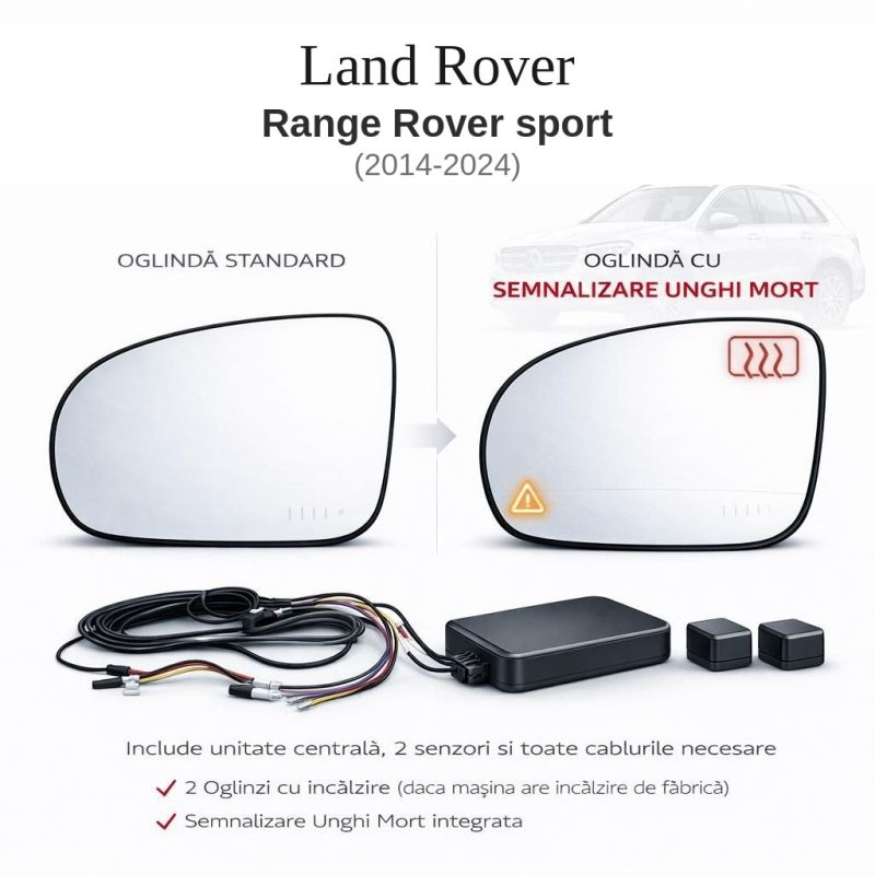 Kit complet senzori unghi mort dedicat pentru Land Rover Range Rover sport (2014–2024). Include 2 oglinzi cu LED de avertizare integrat, 2 senzori radar 24 GHz, unitate de control și cablaj. Montaj direct pe suportul original, fără modificări. Oglinzi cu încălzire păstrată. Sistem dedicat, nu universal.
